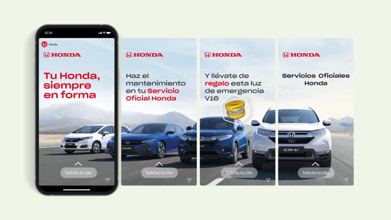 La creatividad se implementó en varias piezas: banners en diferentes formatos, campañas en redes sociales y email marketing segmentados a las bases de datos de clientes Honda. El lanzamiento de la campaña se produjo en septiembre de 2021, coincidiendo con la vuelta a la normalidad post-vacacional y supuso un aumento considerable de visitas a los talleres Honda y una activación de la fidelización de clientes tras la pandemia.