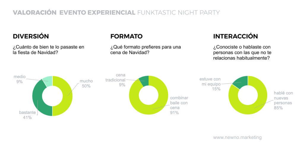 Y por último, queríamos saber cómo se lo había pasado el equipo, cuáles eran sus sugerencias, su valoración y opiniones para futuros eventos. ¿Qué aprendimos? Que el formato fue un acierto y la experiencia todo un éxito, pero que el equipo al completo quiere reunirse para celebrar la próxima fiesta un mismo día y en una misma ubicación. Así que, tomamos nota para la siguiente “no cena” de Navidad.